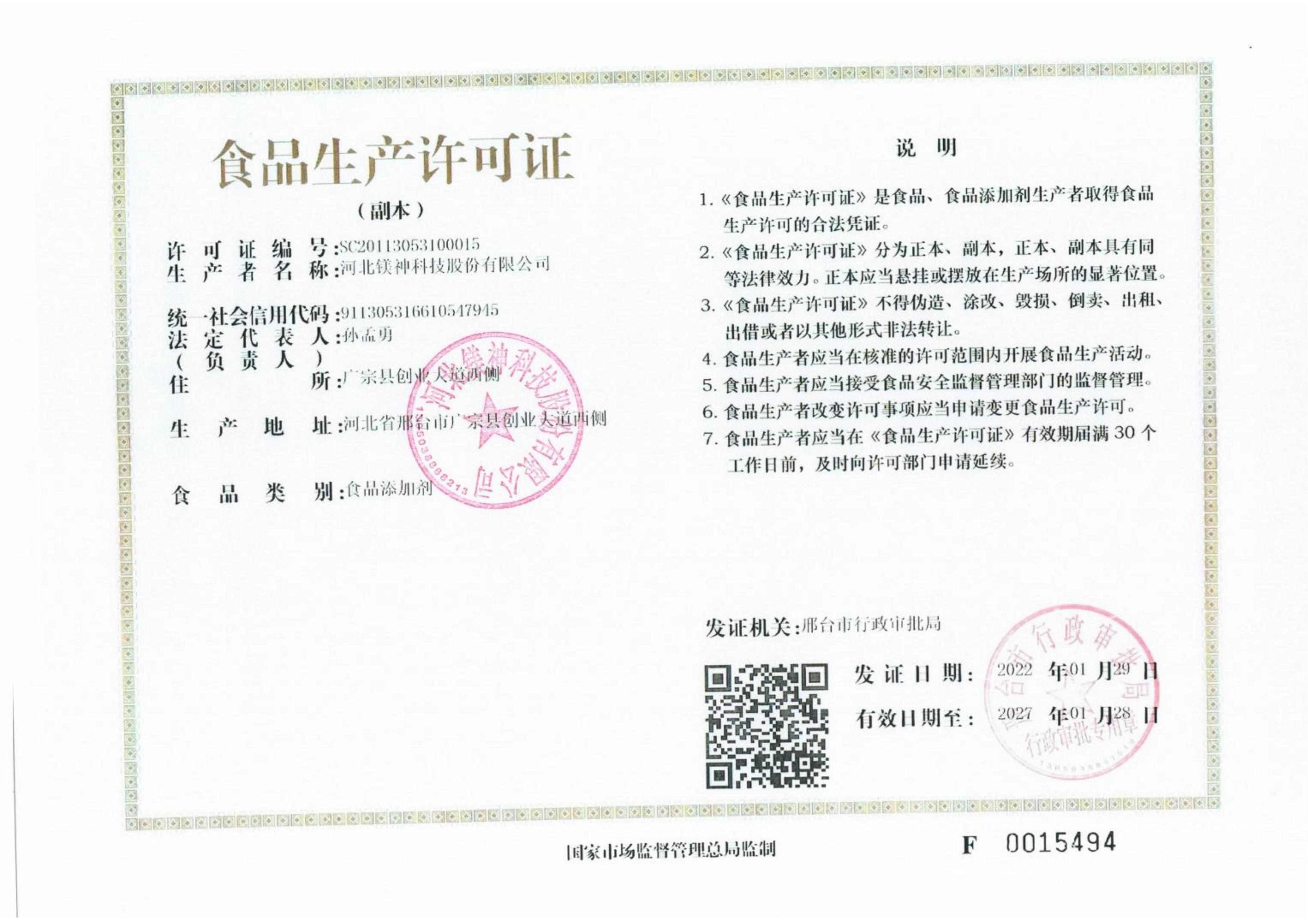 鎂神食品生產(chǎn)許可證副本