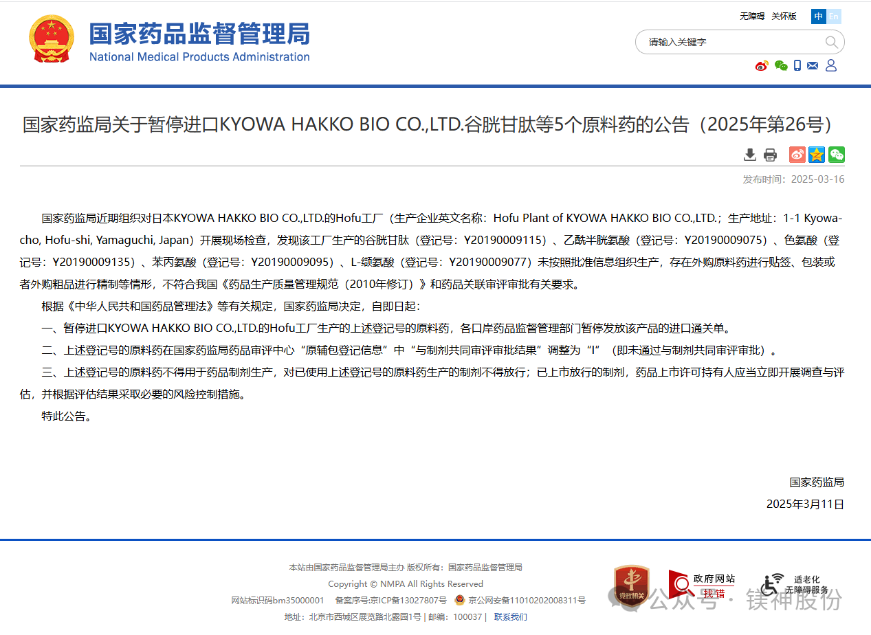 國家藥監局暫停進口日本KYOWA HAKKO BIO CO.,LTD.原料藥,國