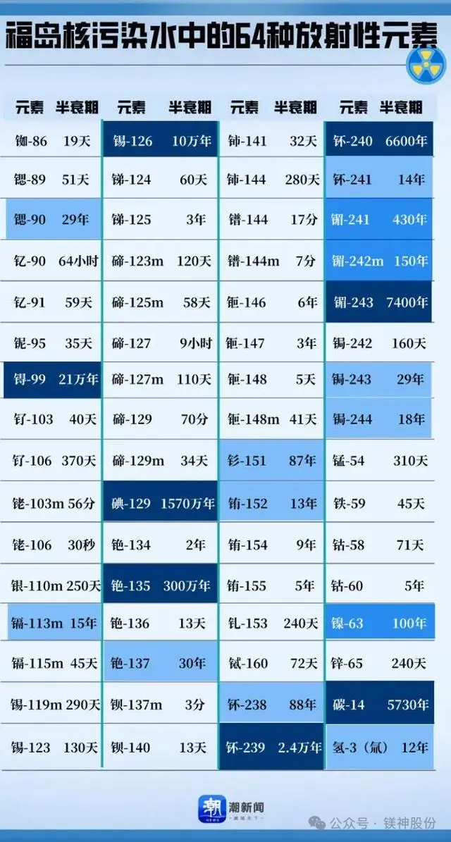 福島核污染水中的54種放射性元素,其中一些如銫-137的半衰期甚至達到30年之長。這意味著這些放射性物質將在海洋環境中存在并影響生態系統和人類健康數十年之久。