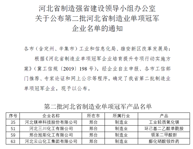 新年新氣象,企業(yè)再添新榮譽,爭得開門紅,近日,河北省工業(yè)和信息化廳官方網(wǎng)站公布了2020年“制造業(yè)單項冠軍產(chǎn)品”企業(yè)名單,我公司生產(chǎn)制造的“工業(yè)輕質(zhì)氧化鎂”獲得了河北省制造強省建設領導小組授予的“制造業(yè)單項冠軍產(chǎn)品”稱號。本次邢臺市通過4家,我們是其中1家。