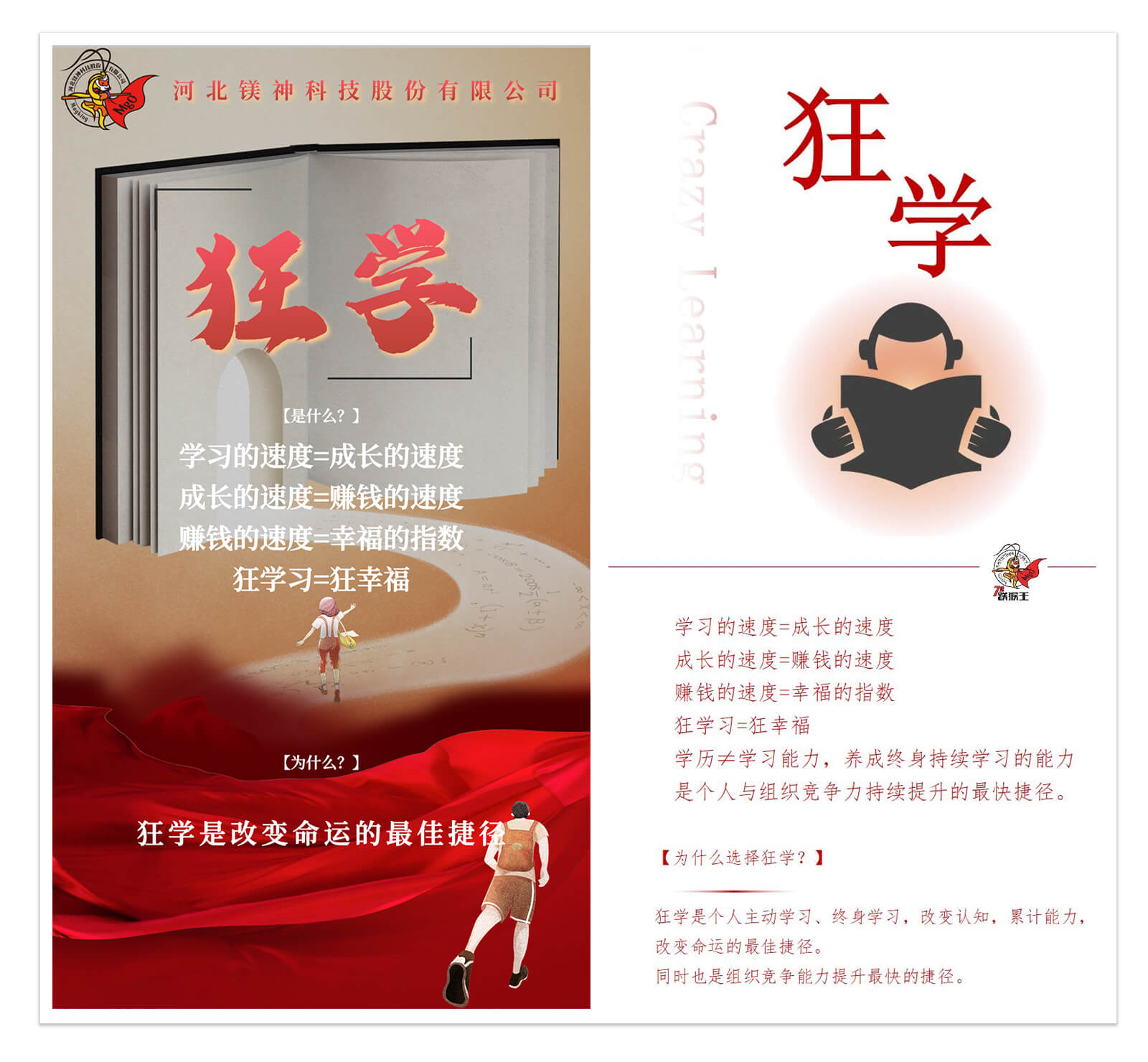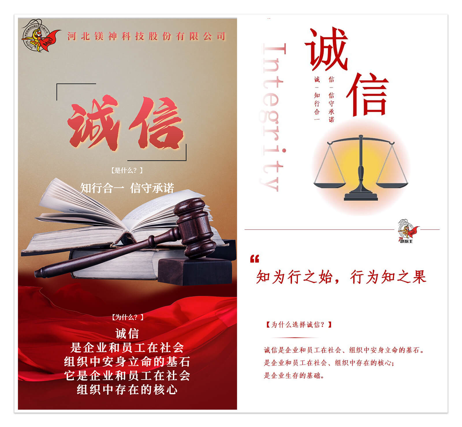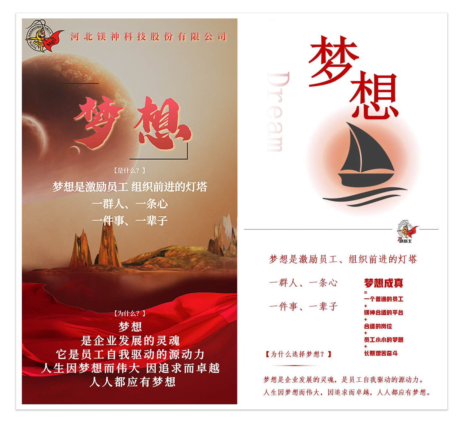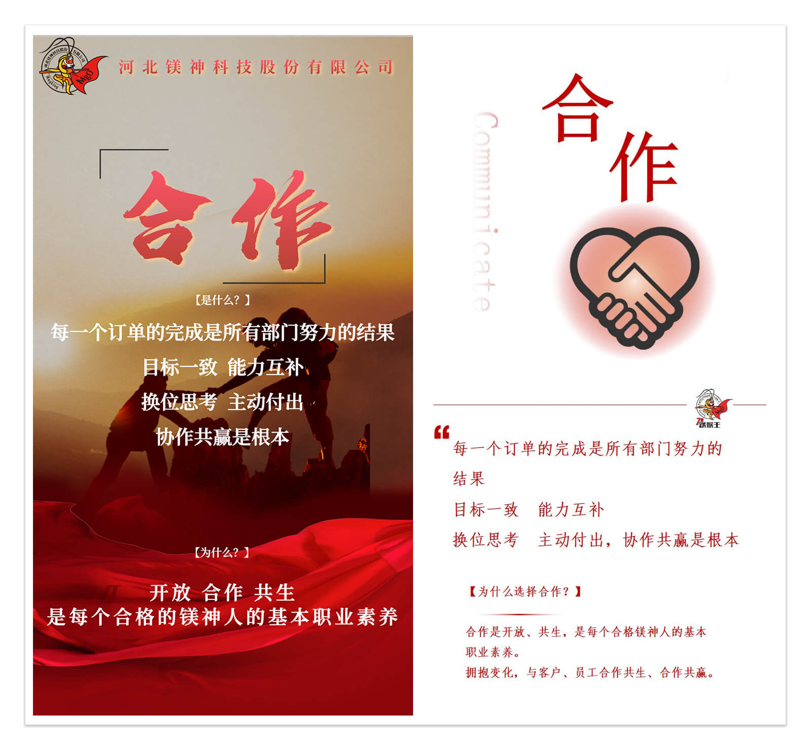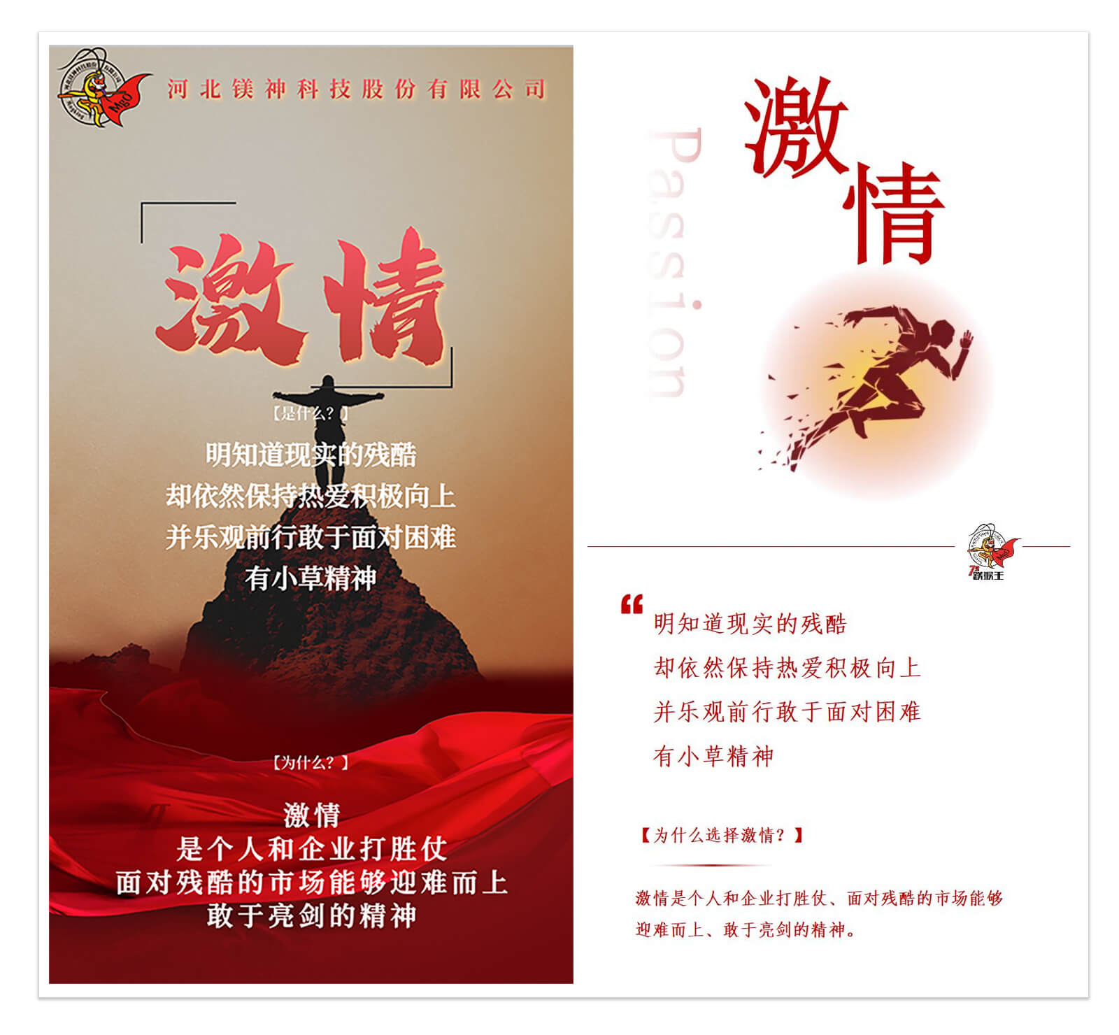 鎂神科技以創辦實業,發展經濟,造福一方,共同富裕為初心;秉承著為全球用戶提供更適合的氧化鎂,為人類健康、科技創新、可持續發展作出貢獻的使命;有著創建百年鎂神平臺,讓客戶、員工、股東共同發展、共同快樂、共同富裕的美好愿景;培育出拼搏、堅韌、越挫越勇的鎂神人。鎂神人用誠信、激情、夢想、狂學、內省、溝通、合作、創新、利他的價值觀向客戶、社會各界朋友詮釋著鎂神的企業文化!