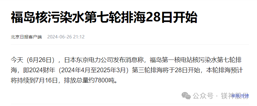 6月26日,日本東京電力公司發布消息稱,福島一號核電站核污染水第七輪排海,即2024財年(2024年4月至2025年3月)第三輪排海將于28日開始,本輪排海預計將持續到7月16日,排放總量約7800噸。
